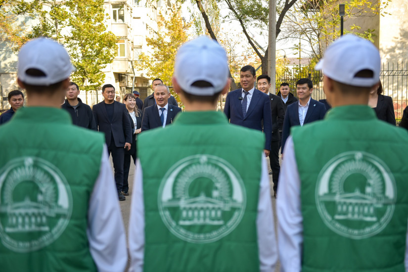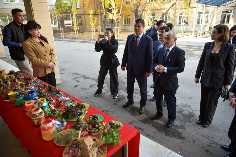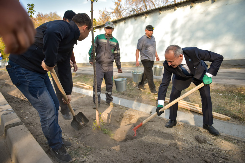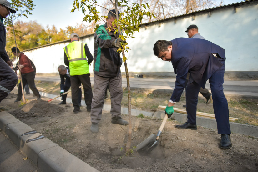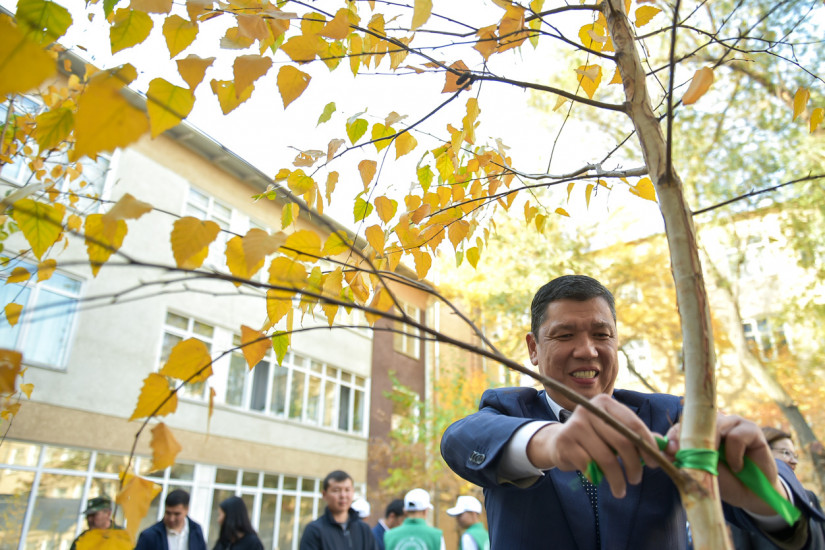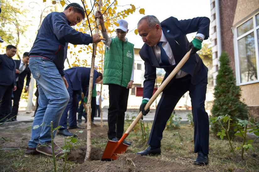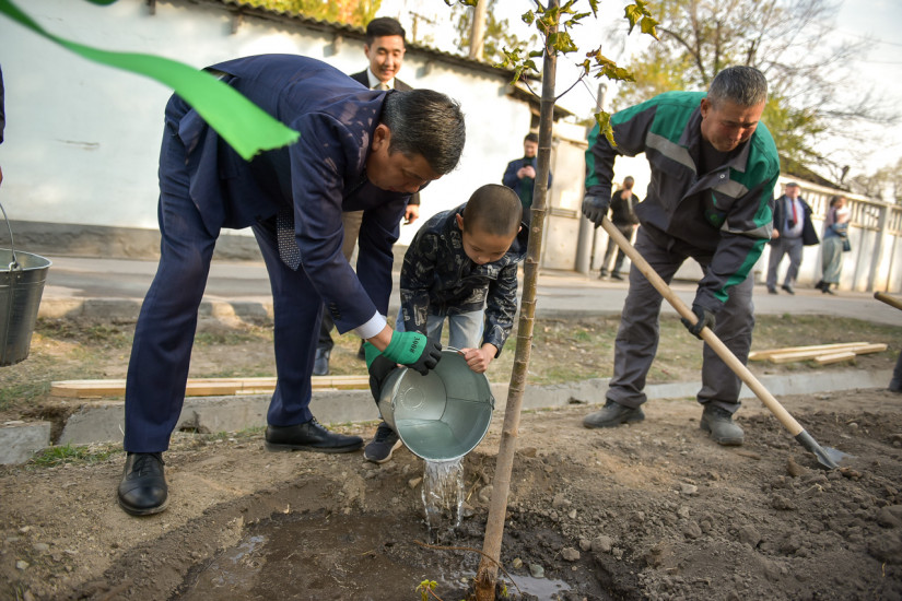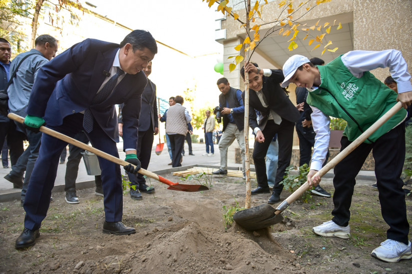 Mayor Aybek Dzhunushaliev, together with the Minister of Natural Resources, Ecology and Technical Supervision of the Kyrgyz Republic, Meder Mashiev, planted seedlings on the territory of school No. 12 in the Sverdlovsk region.