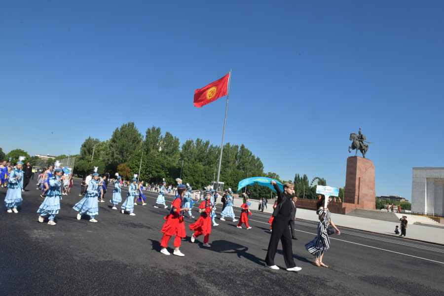 Фестивалдын катышуучулары түркүн түстүү кийимдери менен борбор калаанын мэриясынан Эмен паркына чейин жөө басышты.