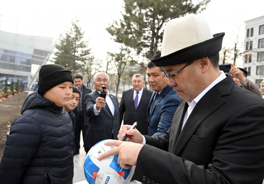 Ачылыш аземинде Президент Садыр Жапаров футбол тобуна кол коюп, аны символдук түрдө келечек муундарга белек катары тапшырды.