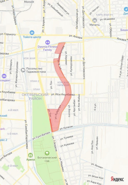 - Куланак көчөсүнөн Молдокулов көчөсү боюнча жана Куйручук көчөсүнөн Кулмурзаев көчөсүнө чейин;