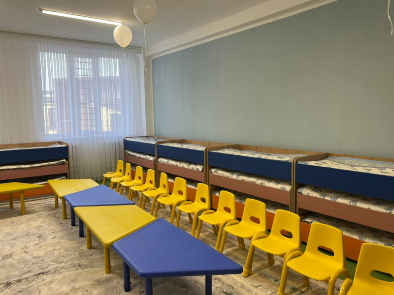 Биринчи жана экинчи кабатта кабыл алуу бөлмөлөрү жана кийим алмаштыруучу жайлар, оюн жана уктоо бөлмөлөрү, ашкана, даярдоо жана таратуу бөлмөсү, идиш жууучу жай, жашылча жана кургак азыктар үчүн кампалар, медициналык кабинет, изолятор, дезинфекциялоо бөлмөсү, кир жуу жана үтүктөө бөлмөсү, электр калканы, кызматкерлер үчүн бөлмө жана санитардык түйүндөр жайгашкан.