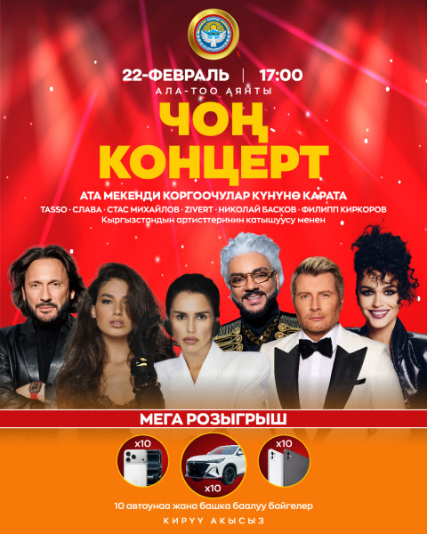 22-февралда саат 17:00дө кыргыз жана орус эстрада жылдыздарынын катышуусунда майрамдык концерт өтөт.