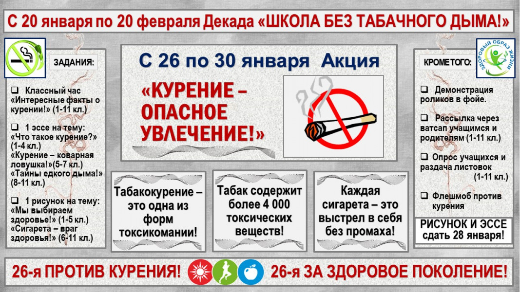 Башталгыч жана орто класстардын окуучулары үчүн «Зыяндуу адаттардын алдын алуу жана сергек жашоо образын калыптандыруу» жана «Эмне үчүн спортчулар чекпейт?» деген темаларда тематикалык сабактар уюштурулууда.