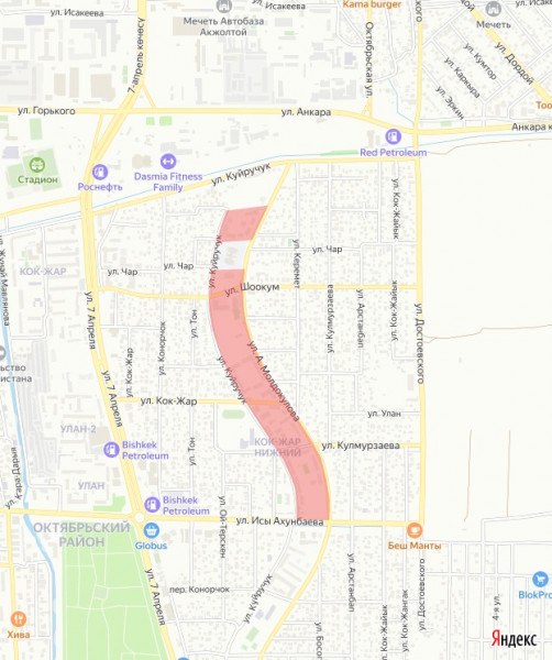 Өчүрүү аймагы: Куйручук көчөсү – Молдокулов көчөсү – Ахунбаев көчөсү – Куйручук көчөсү.