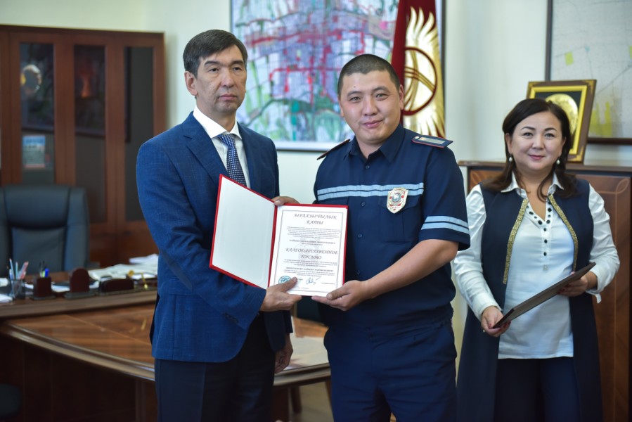 5 октября мэр города Бишкек А.Суракматов лично поблагодарил, вручил благодарственные письма и материальную помощь по 20 тысяч сомов сержанту милиции Толону Кожокматову и старшине милиции Байышу Эшбергенову, сотрудникам УОБДД ГУВД г.Бишкек за спасение жизни подростка и за бдительность.