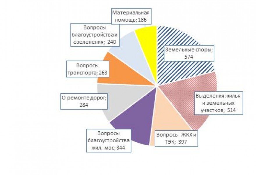 Наиболее часто граждане поднимают вопросы по: земельным спорам – 12 % к общему количеству обращений,выделению жилья и земельных участков – 10 %, вопросам ЖКХ и ТЭК– 8 %, благоустройству жилых массивов – 7 %, ремонту дорог – 6 %, вопросам транспортной сферы – 5 %, благоустройству и озеленению – 5 % и оказанию материальной помощи – 4 %.