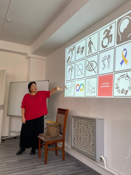Тренинг провели международный эксперт по инвалидности Рахат Орозова и член Общественного объединения «Кыргызское общество слепых и глухих» (КОС и КОГ) Алия Турдиева. В мероприятии также приняла участие директор библиотеки для слепых, которая является частью Общественного объединения «Кыргызское общество слепых и глухих» (КОС и КОГ) Кундуз Касымбаева.