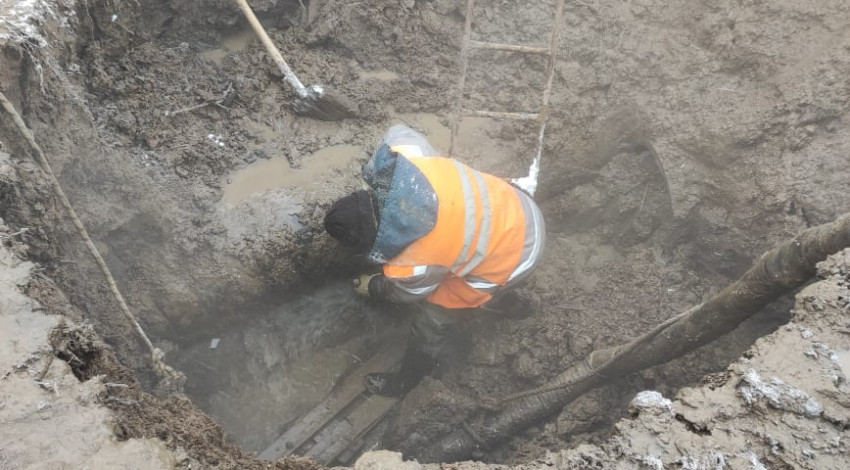 The brigade of the drainage service eliminated the accident in the village of Mayevka. The work is not easy, especially in the winter cold. The workers had to dive into a dug-out pit and work knee-deep in water. In addition, in order to eliminate the damage, it was necessary to mince a pressure collector with a diameter of 600 mm.