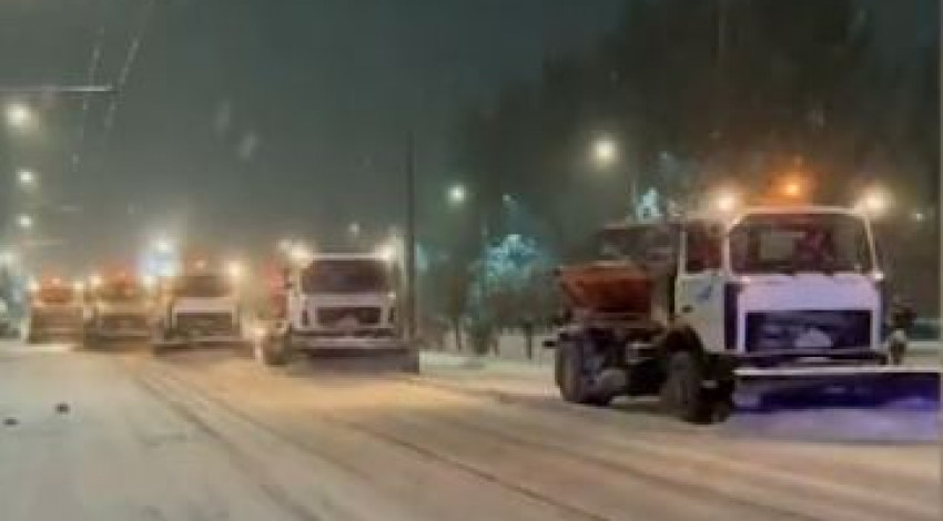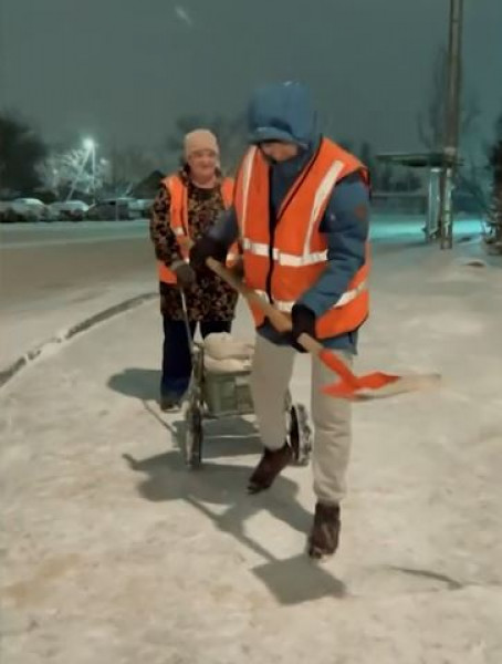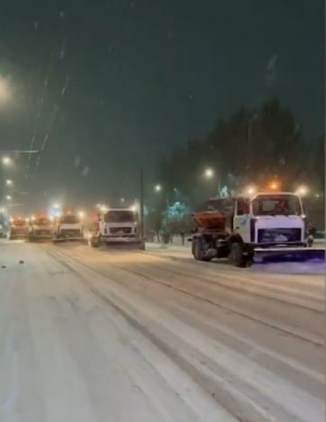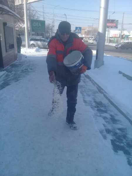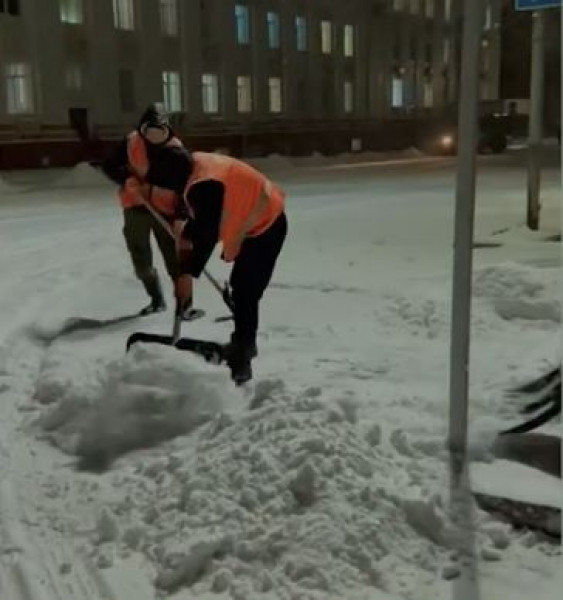 The municipal enterprise "Tazalyk" cleaned snow from the roadway all night. Now the second shift has gone out to clean the streets and sidewalks.