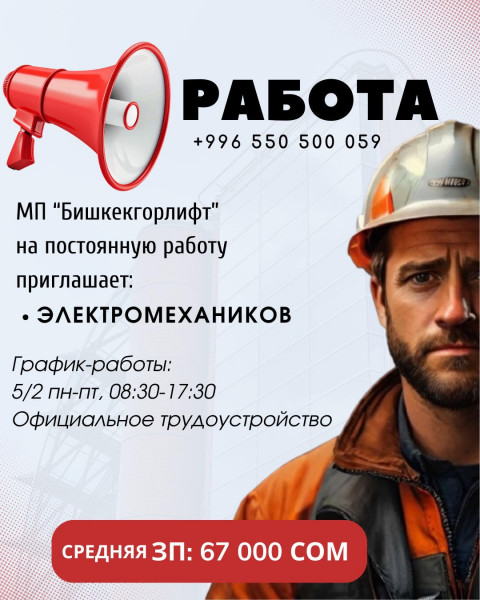 The municipal enterprise “Bishkekgorlift” is inviting specialists to apply for the position of Electromechanic for Elevator Maintenance.