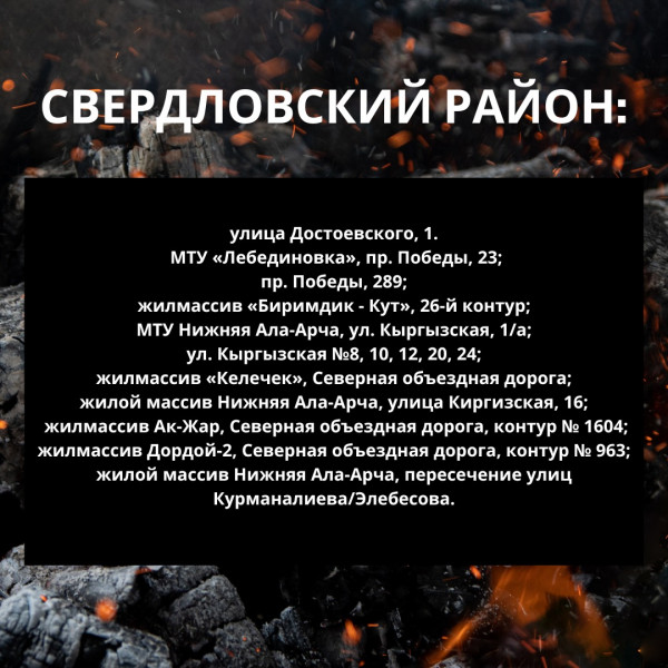 - Lower Ala-Archa Residential Area, intersection of Kurmanalieva and Elebesov Streets.