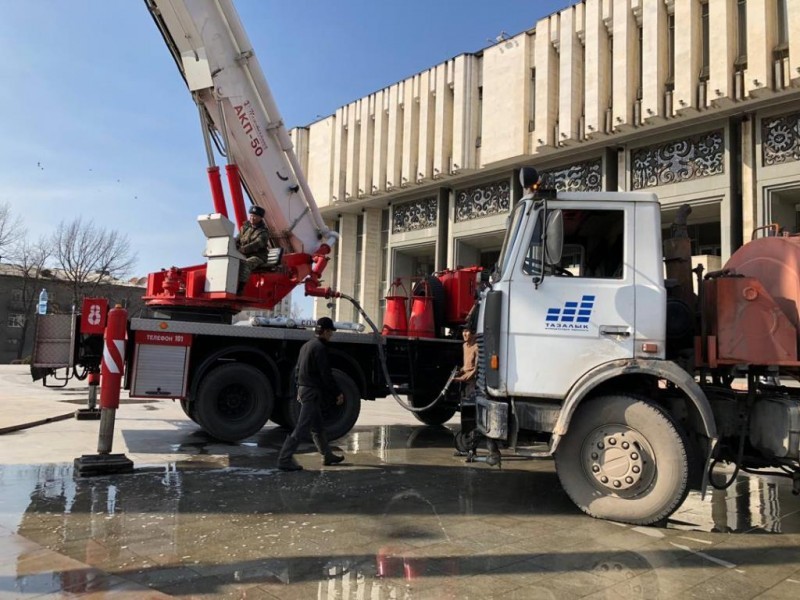 Ошондой эле, көчөлөрдүн жуулушу да уланып жатат. Тазалоо үчүн 26 атайын техника даяр жана кызмат кылууда.