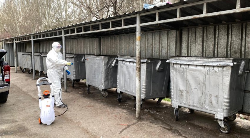 "Тазалык" муниципалдык ишканасынын кызматкерлери таштанды салуучу контейнерлерди жана аянттарды дезинфекциялап, дайыма жууп турушат.
