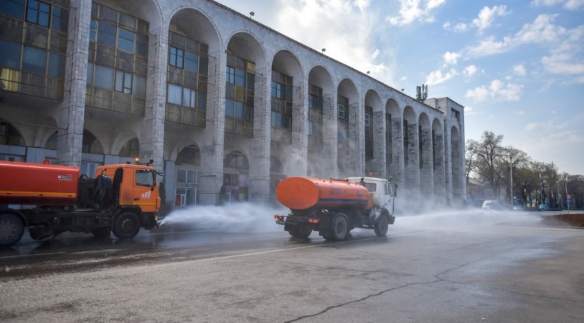 Ошондой эле, дезинфекция иш-чаралары борбордогу тротуар жана скверлерде жүргүзүлүп жатат.