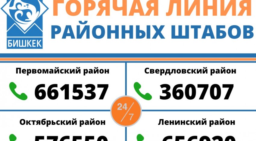 Эгер сиздин районуңузда, кварталнызда же бакчаңызда эпидемиологиялык кырдаал боюнча кандайдыр бир түшүнбөстүктөр, же суроолор жаралса, анда күнү-түнү иштеген райондук штабдарга чалыңыздар: 661537 – Биринчи май району, 656920 – Ленин району, 531583 – Свердлов району жана 576550 – Октябрь району.Шаардык штабдын номуру: 625813, 0555839379 WhatsApp: 0705 025 010.