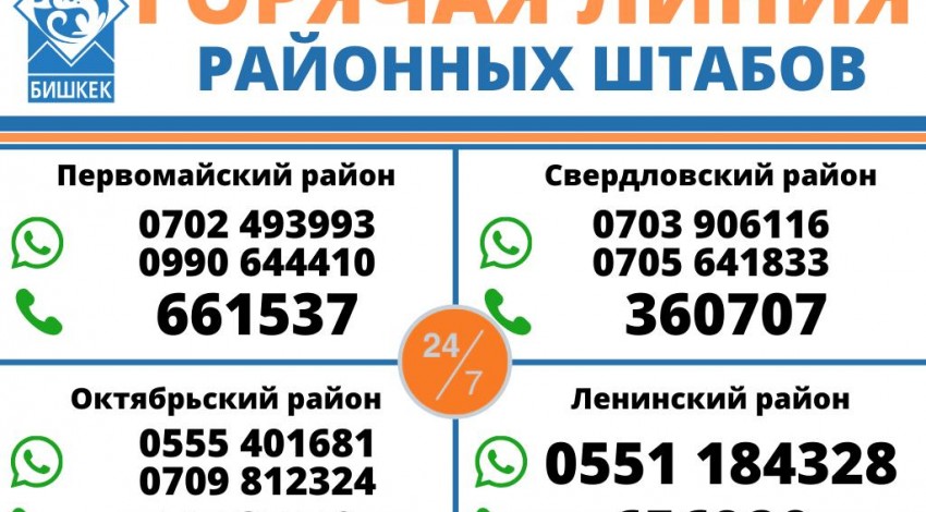 Урматтуу шаардыктар! Өтүнөбүз! Кошуналарыңыз менен, бул маалыматты бөлүшуңүздөр! Кайрылыңыздар! Райондук акимиатка чалып же WhatsApp аркылуу байланышыңыздар. Чалуулар көп болгонуна байланыштуу жардам ала турган номурлардын санын көбөйттүк: