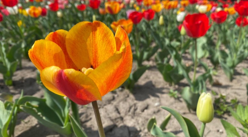 Жазгы гүлдөр кооздугу, ар түрдүү түсу жана сорту менен шаардыктарды сүйүндүрөт. Кызыл, ак, кызгылтым, сары, кызгылт көк өңдүү гүлдөрдү байкоого болот. Бул жылы борборубуздун клумаларында 10 сорттун 185 миң баш тюльпаны пайда болду. Алар Курманжан Датканын эстелигинин айланасында, жаштар аллеясында, Т. Сатылганов атындагы Кыргыз улуттук филармониясынын жанында, Пушкин галереясынын тегерегинде, "Театралдык" скверинде, Элдердин Достугу монументинин айланасында, КР өкмөт үйүнүн тегерегинде, Свердлов жана Октябрь акимиаттарынын имаратында, Фрунзе жана Ибраимов, түштүк магистралдагы Ахунбаев жана 7-апрель көчөлөүнүн кесилиштеринде гулдөп жатышат.