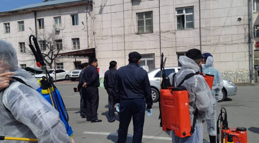 Санэпидкөзөмөлдүн адистери Бишкек шаарынын шаардык ички иштер башкармалыгынын имаратын атайын аралашма менен тазалап чыгышты.