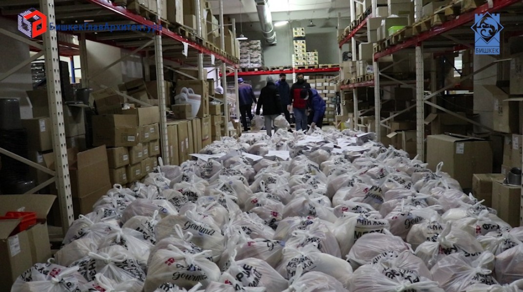 Райондук штабдардын тизмелерине ылайык жардамга муктаж болгон шаардыктарга май, кант, күрүч, акшак жана кесме азыктары таратылат.