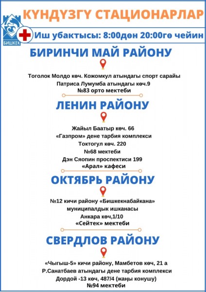 Урматтуу шаар тургундары! Бишкекте курч кармоочу респиратордук вирустук инфекциянын жеңил түрү менен ооруп жаткандарды кабыл ала турган стационарлар саат 8:00дөн 20:00 гө чейин иштеп жатат. Стационарлардан ийне жана тамчылатып дары куюу же болбосо медициналык кеңеш ала аласыздар.