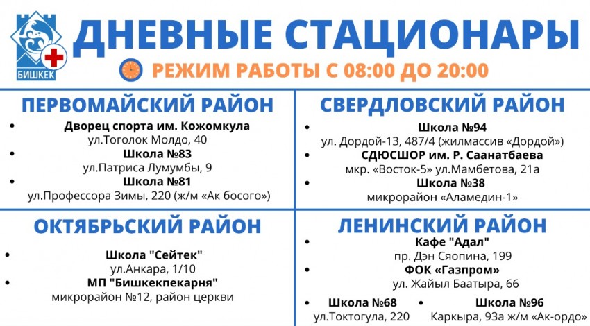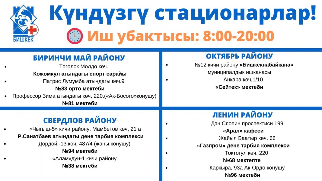Мэриянын күндүзгү стационарлары саат 8:00дөн 20:00 гө чейин күчөтүлгөн режимде иштеп жатат. 9 күндүн ичинде стационарлар 23 миң 819 жаранды кабыл алды. Анын ичинен 17 миң 890 ийне жана тамчылатып дары алышты, 781 тургунга медициналык кеңеш берилип, 139 адам жаткырылды. Тилекке каршы, 9 адам көз жумду.
