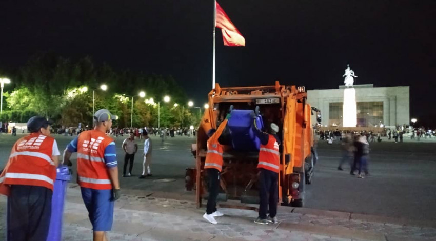 «Тазалык» муниципалдык ишканасынын кызматкерлери таң аткандан түнгө чейин иштеп, жыйынтыгында «Ала-Тоо» борбордук аянтынан эки тонна таштанды чыгарышты.