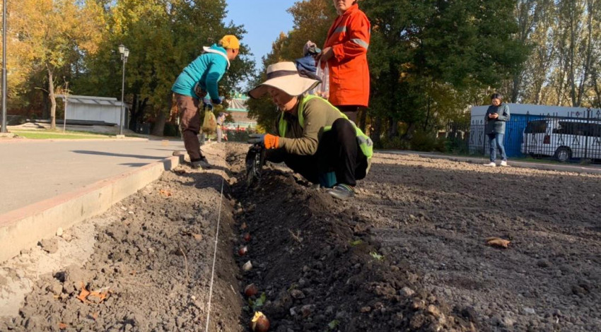 Шаар өз ишин улантууда. "Бишкекжашылчарба" муниципалдык ишканасынын кызматкерлери борбор калаанын гүлзарларына жоогазындын баштарын отургуза баштады.