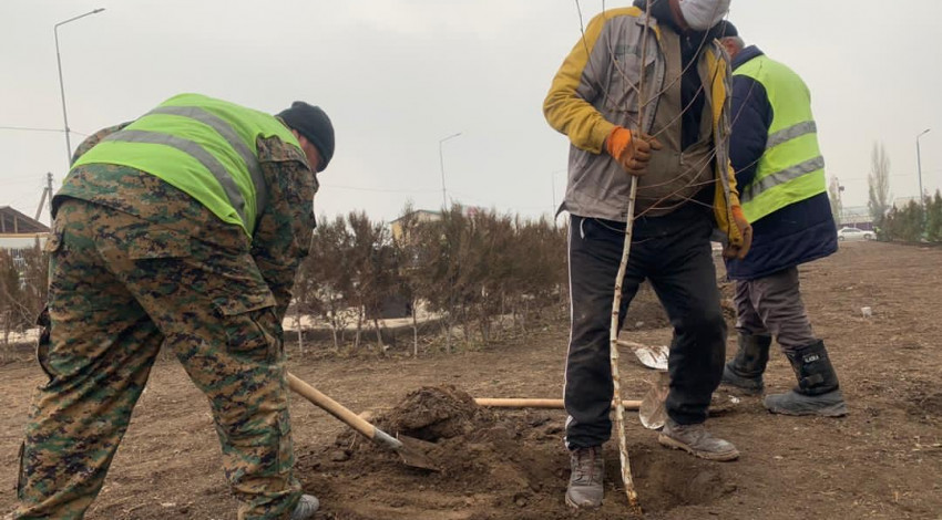 Шаар өз ишин улантууда. Ак-Ордо жаңы конушунда Тагай-Бий жана Гагарин көчөлөрүнүн кесилишиндеги №96 мектептин жанында "Бишкекжашылчарба" муниципалдык ишканасынын кызматкерлери көчөттөрдү отургузуп жатышат.
