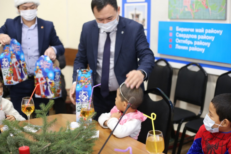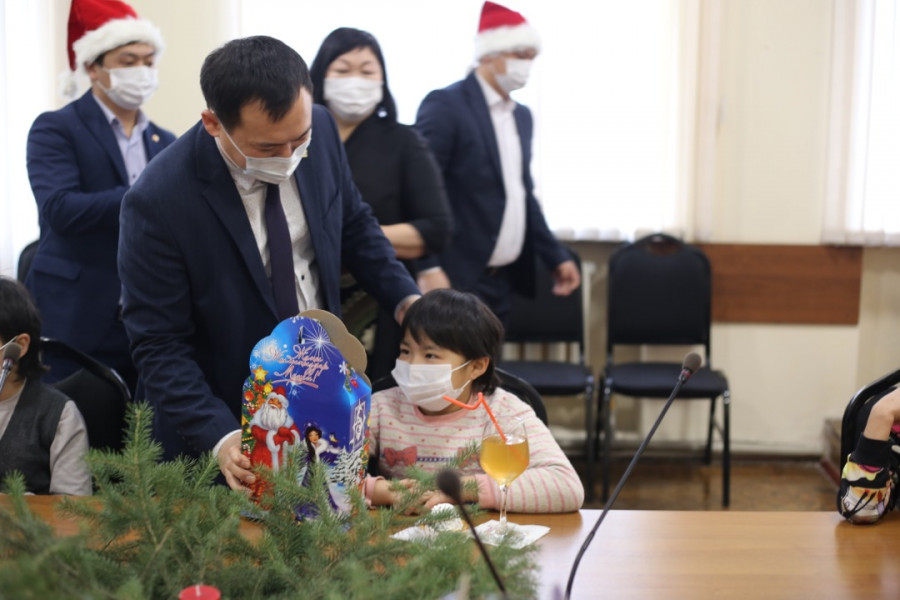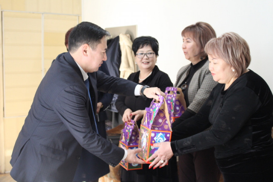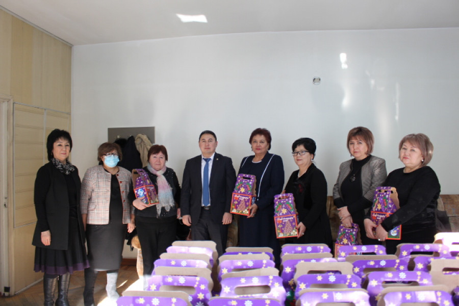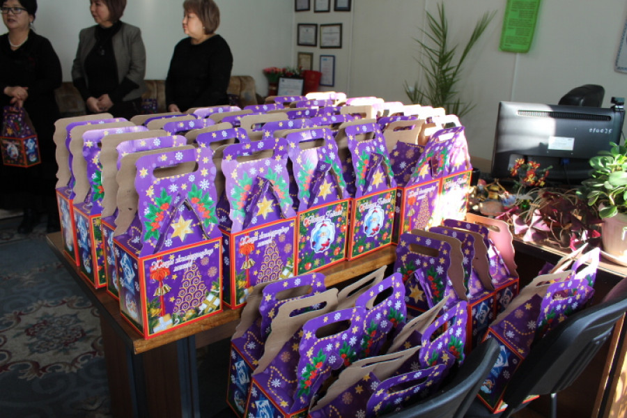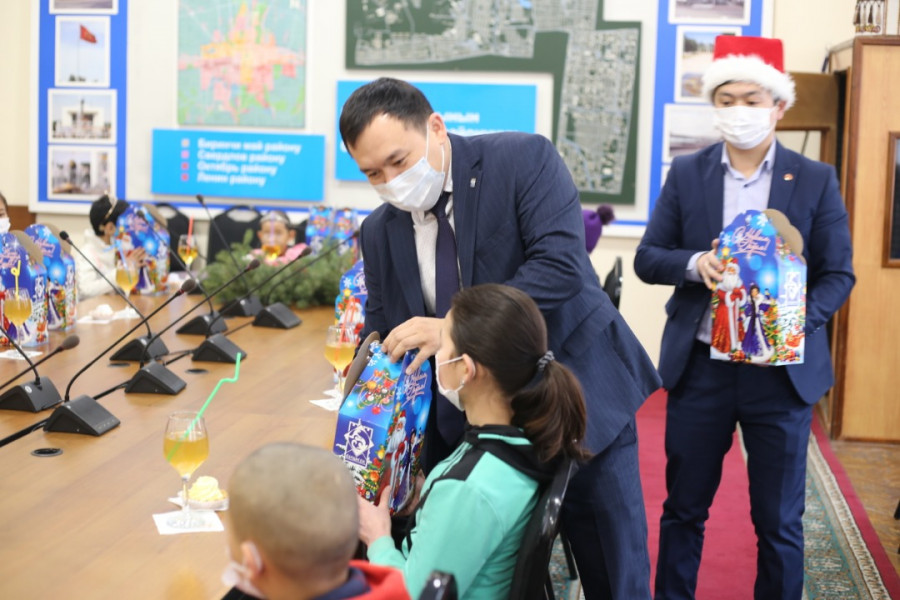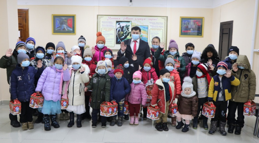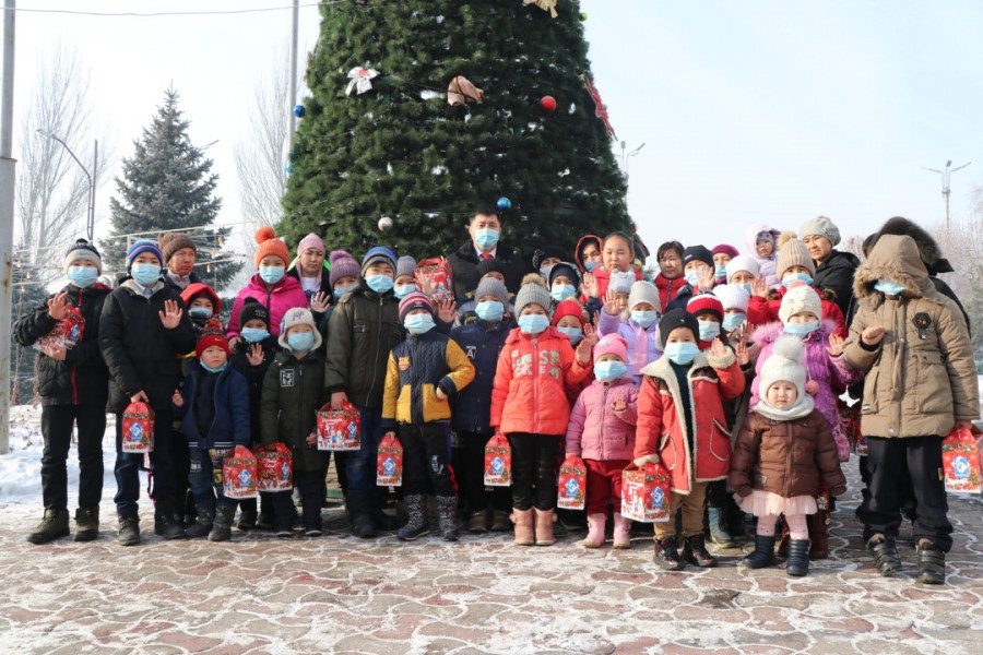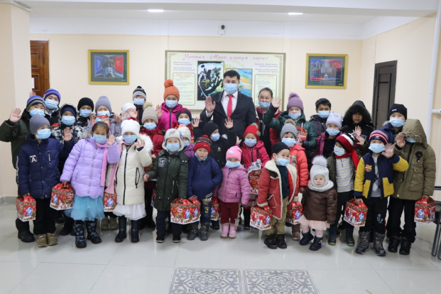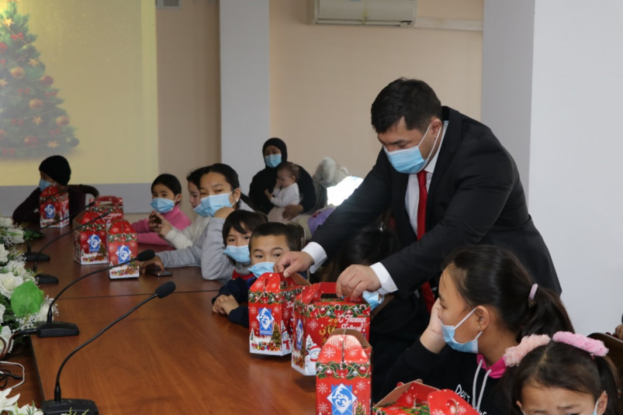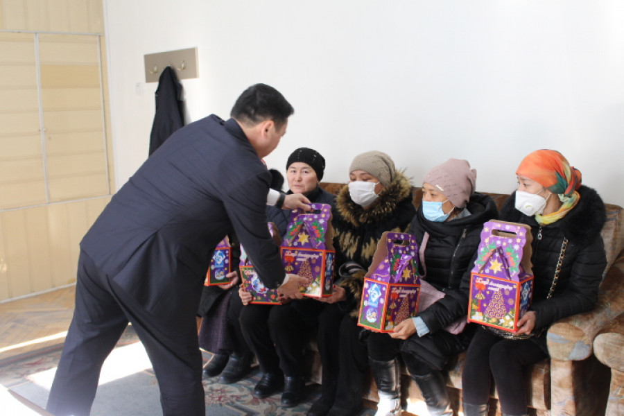 Аким менен биргеликте социалдык маселелер боюнча орун басары Аида Рысбаева райондук социалдык өнүктүрүү башкармалыгынын каттоосунда турган, аз камсыз болгон үй-бүлөлөрдүн 20 баласына жаңы жылдык белектерин тапшырды.