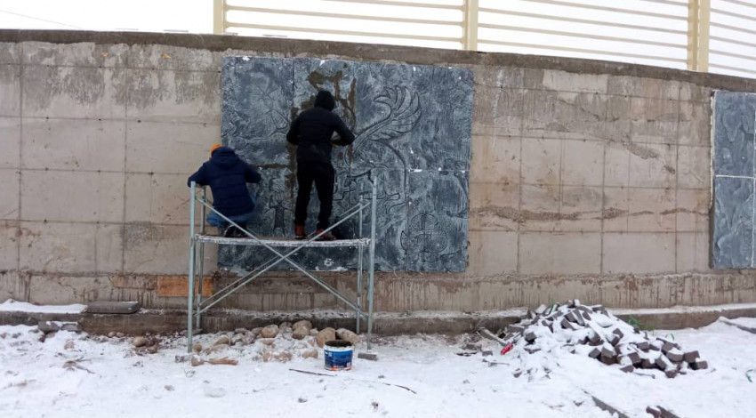 Адистер буга чейин театрдын отургучтары үчүн темир конструкцияларды отнотушту. "Боз үй" темир инсталляциясын табигый таштар менен каптоо иштери жүрүп жатат.