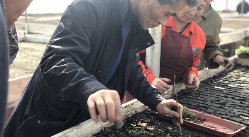 "Биоусмир" компаниясынын жана "Инновация" коомдук фондунун өкүлдөрү күнөсканаларда биздин өсүп жаткан өсүмдүктөргө жер семирткичти кантип туура чачуу керектигин көрсөтүштү.