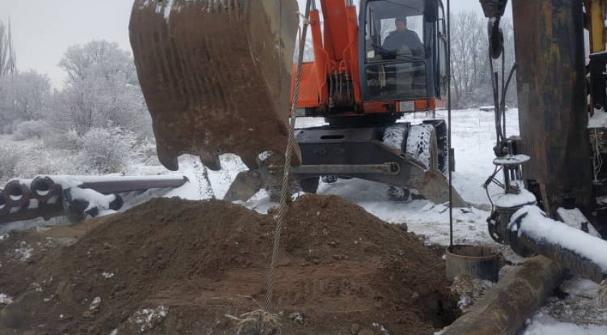 Жумуш оор, анткени тереңдик насосун скважинага салып, ошол эле учурда 92 метрлик суу көтөрүүчү түтүк орнотулууда.