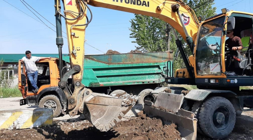 Васильев көчөсү Манас көчөсүнөн Түлөбердиев көчөсүнө чейинки тилкеде арык плиталары экскаватордун жардамы менен алынууда. Арыктар тазаланып жатат.