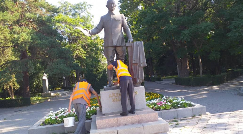 "Тазалык" муниципалдык ишканасынын кызматкерлери эстеликтерди тазалоону улантууда.
