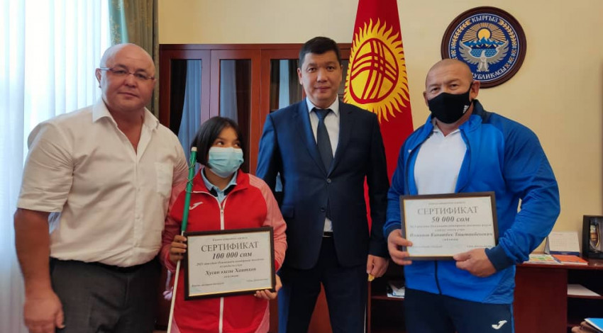 Жетишкендиктери үчүн спортчуга 100 миң сом, ал эми машыктыруучуга 50 миң сом сертификат тапшырылды.