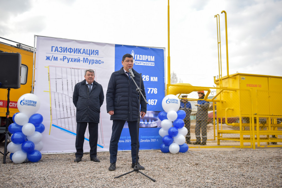 «Рухий-Мурас» жаңы конушуна жаратылыш газын салтанаттуу берүү иш-чарасы өткөрүлүп, ага Бишкек шаарынын мэри Айбек Джунушалиев жана «Газпром Кыргызстан» компаниясынын башкы директорунун орун басары Мурат Сулайманов катышты.