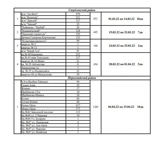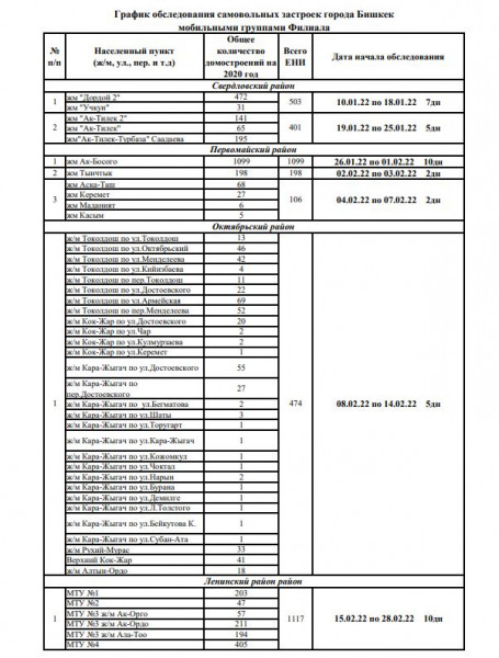 Ошондой эле, “Ала-Тоо”, “Дордой”, “Арча-Бешик”, “Керамическая”, “Төкөлдөш”, “Ак-Ордо”, “2-Черепки”, “Кара-Жыгач”, «Тынчтык», «Учкун» конуштарынан 2021-жылдын 13-декабрынан бери 443 арыз кабыл алынган.