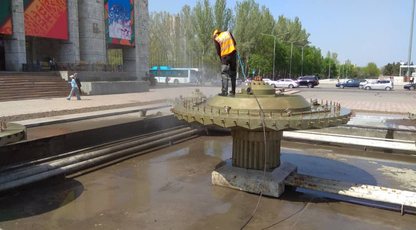 Учурда Ала-Тоо борбордук аянтында фонтандарды ылайдан жана топурактан тазалоо иштери жүрүп жатат.