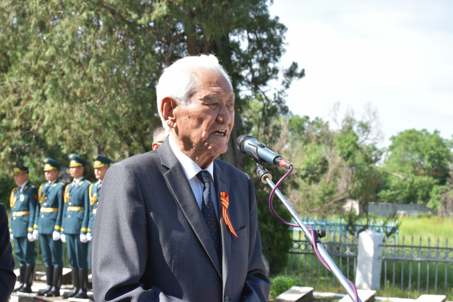 Улуу Ата Мекендик согуш учурунда курман болгондорду бир мүнөт тыныгуу менен эскерип, курман болгон жоокерлердин мемориалына гүл коюлду.