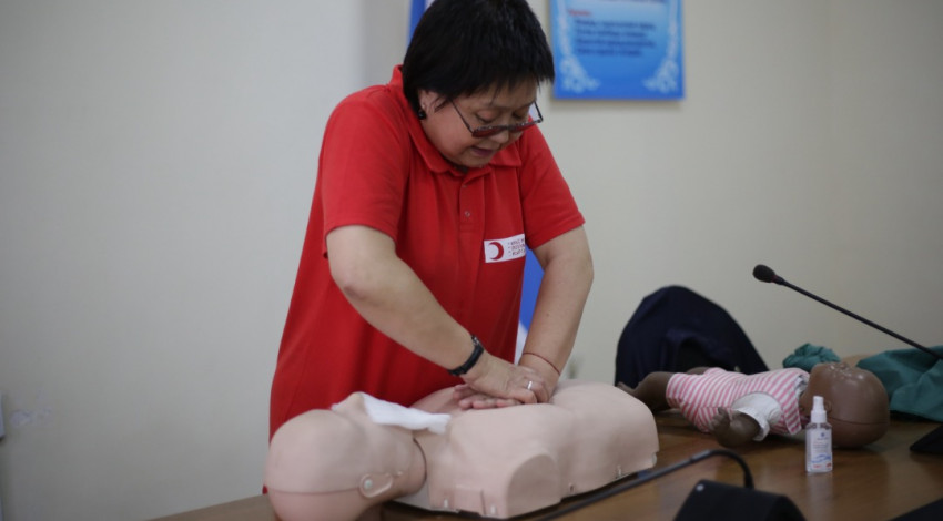 Биринчи жардам көрсөтүүнүн теориялык жана практикалык негиздери жана ыкмаларын Кыргызстан Кызыл Жарым Ай коомунун кызматкери, биринчи жардам көрсөтүү боюнча инструктор Нурбюбю Керимова түшүндүрүп, көрсөтүп берди.