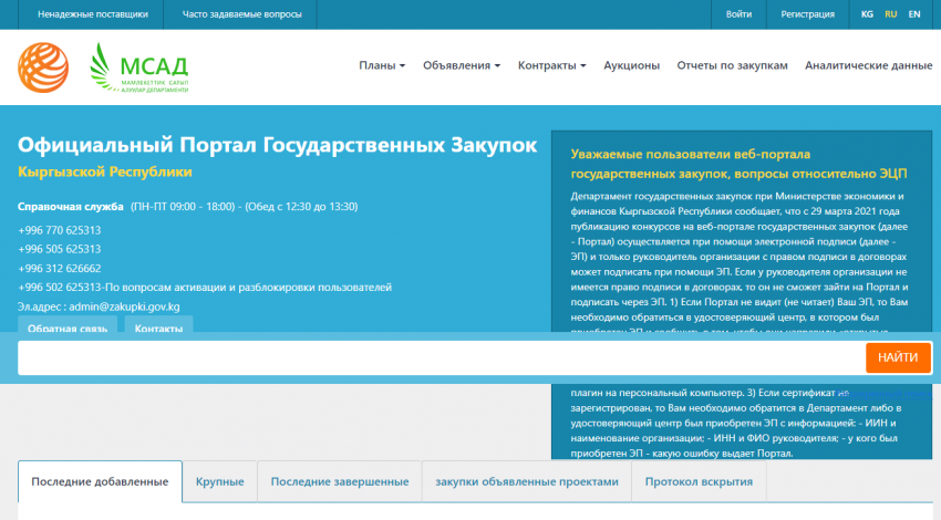 Урматтуу шаардыктар жана ишкерлер! Конкурстар жөнүндө толук маалымат мамлекеттик сатып алуулар порталында жарыяланды: www.zakupki.gov.kg