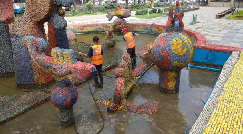 "Тазалык" муниципалдык ишканасы борбор калаадагы фонтандарды жууп-тазалоо иштерин жүргүзүп жатат.