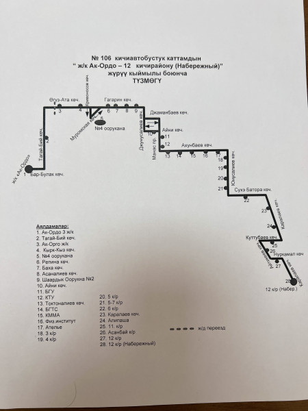 Жыйынтыгында Жунусалиев-Жаманбаев-Ч.Айтматов көчөсүнүн чыгыш багыттагы участогундагы "Элек" ЖЧКсынын 106-кичи автобустук каттамынын жүрүү схемасын жарым-жартылай өзгөртүү чечими кабыл алынды.