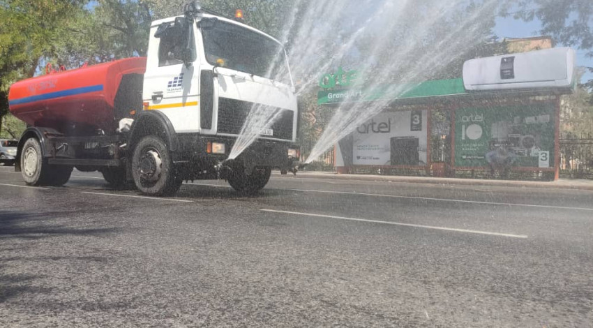 Бишкек шаарынын ар бир административдик районуна 2ден атайын техника чыгып жолдорго суу чачууда. Ар бир унаа 8 тоннага жакын суу чачып жатат.