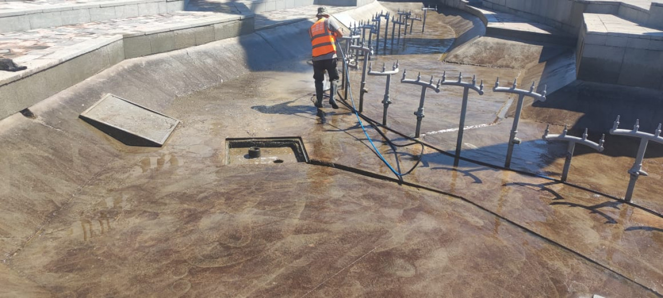 Тазалоо иштерине жалпы 10 жумушчу жана 3 атайын техника тартылган. Күн сайын адистер фонтандардын ичтериндеги жалбырактарды, ар кандай таштандыларды чогултушат. Андан кийин мотор, насосторунун иштешин текшеришет. Жай мезгилинде фонтандардын иштешинде кѳйгѳй жаралса, дароо оңдолот, ал эми кышында капиталдык оңдоо жүргүзүлѳт.