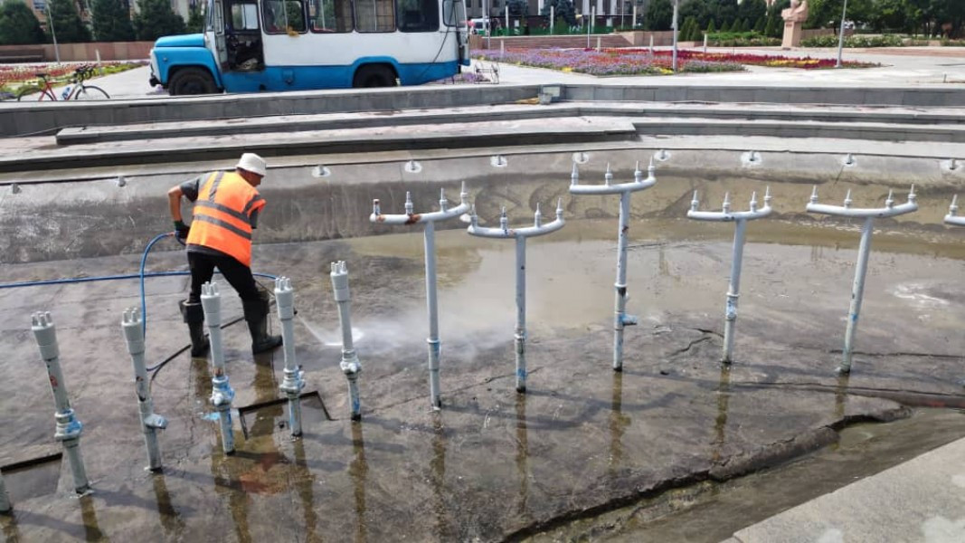Азырыкы тапта жаштар аллеясындагы, Т.Сатылганов атындагы Кыргыз улуттук филармониясынын, Тарых музейинин алдындагы, «Ала-Тоо» аянтындагы фонтандар жуулуп жатат.