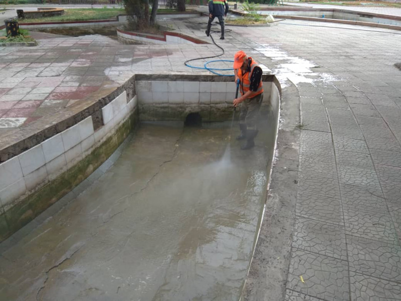 “Тазалык” муниципалдык ишканасынын кызматкерлери борбор калаадагы фонтандарды жууп тазалоодо.