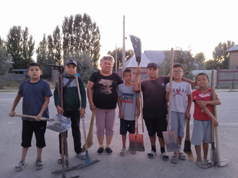 Күрөк, колкап, тырмоо жана таштанды баштыктары менен куралданган жаштар өздөрүнө бөлүнүп берилген жерлерди тыкандык менен тазалашты.