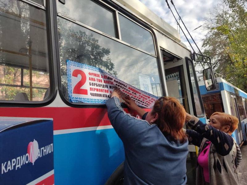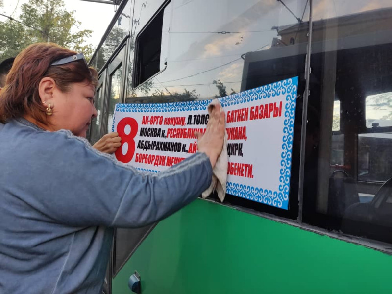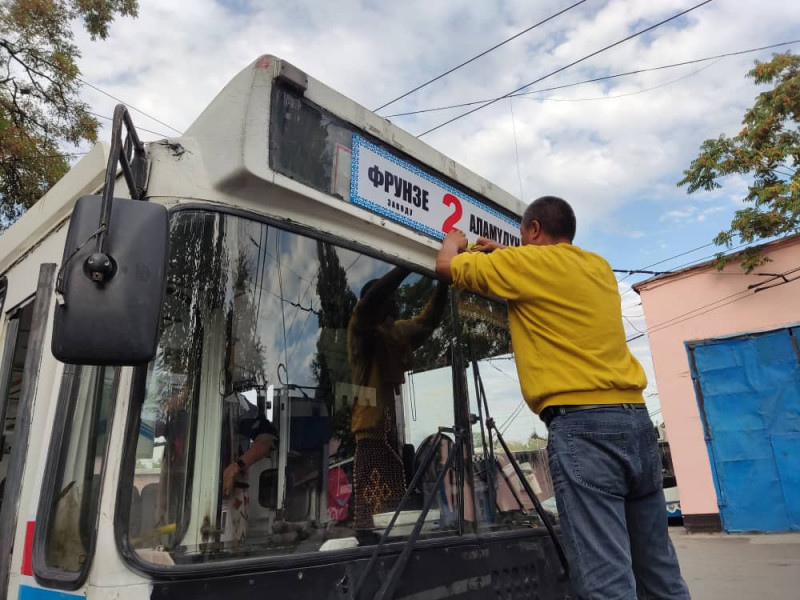 Учурда троллейбустардагы трафареттер толугу менен кыргыз тилине алмаштырылды. Мындан тышкары троллейбустун ичин, сыртын сырдоо жана ичин тазалоо иштери жүрүп жатат.