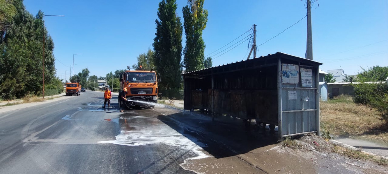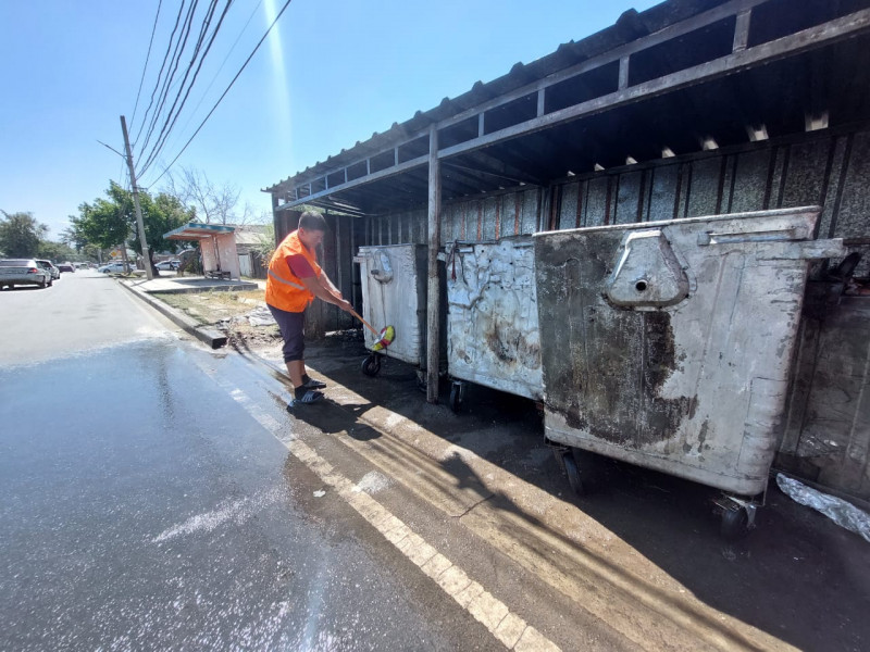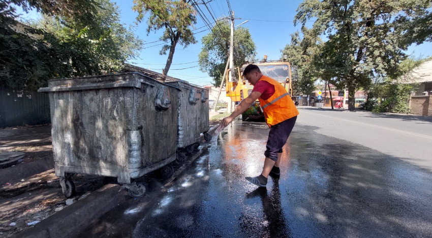 “Тазалык” муниципалдык ишканасы таштанды челектерди жана аянтчаларды кайрадан жууп тазалоодо.